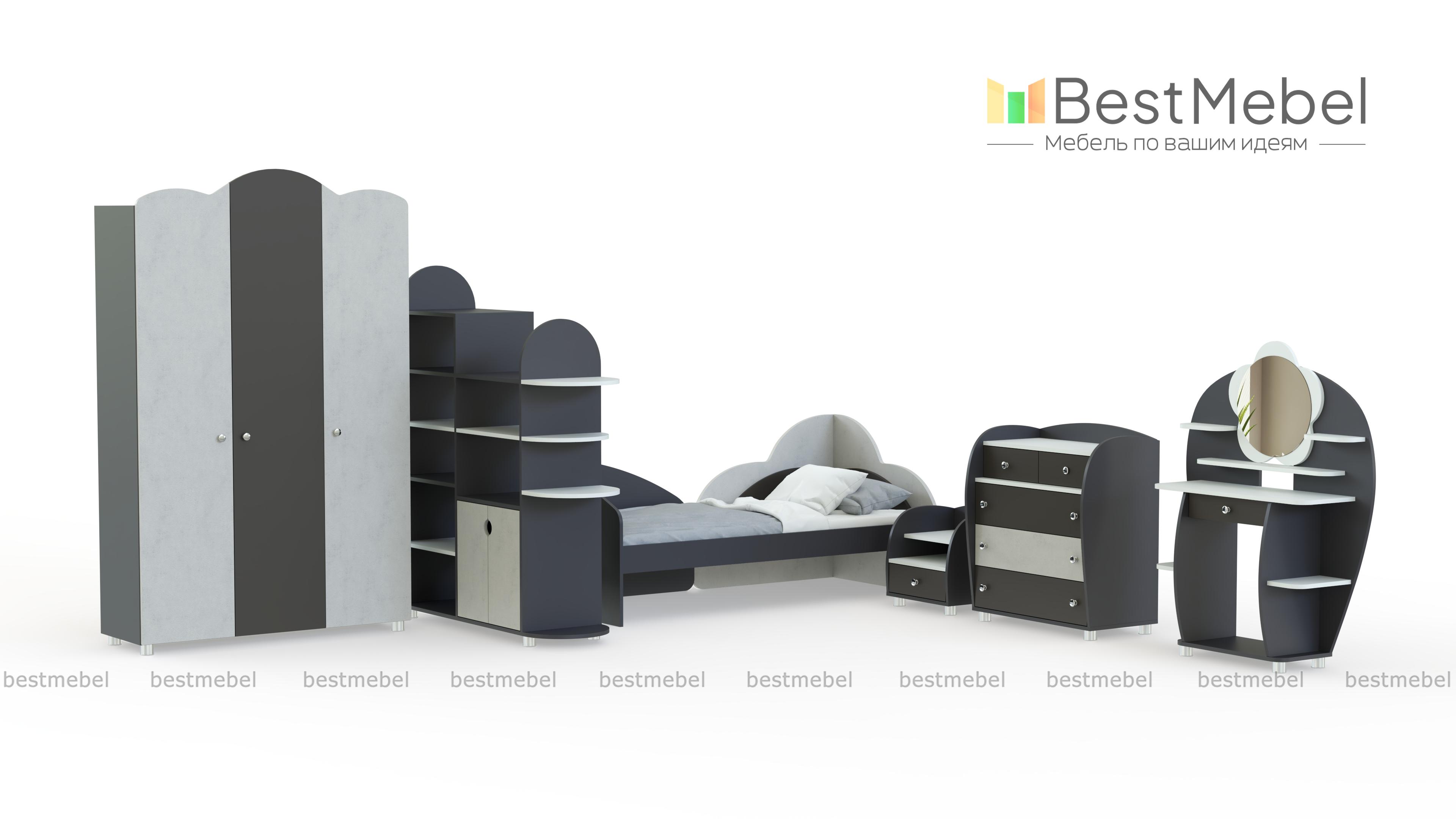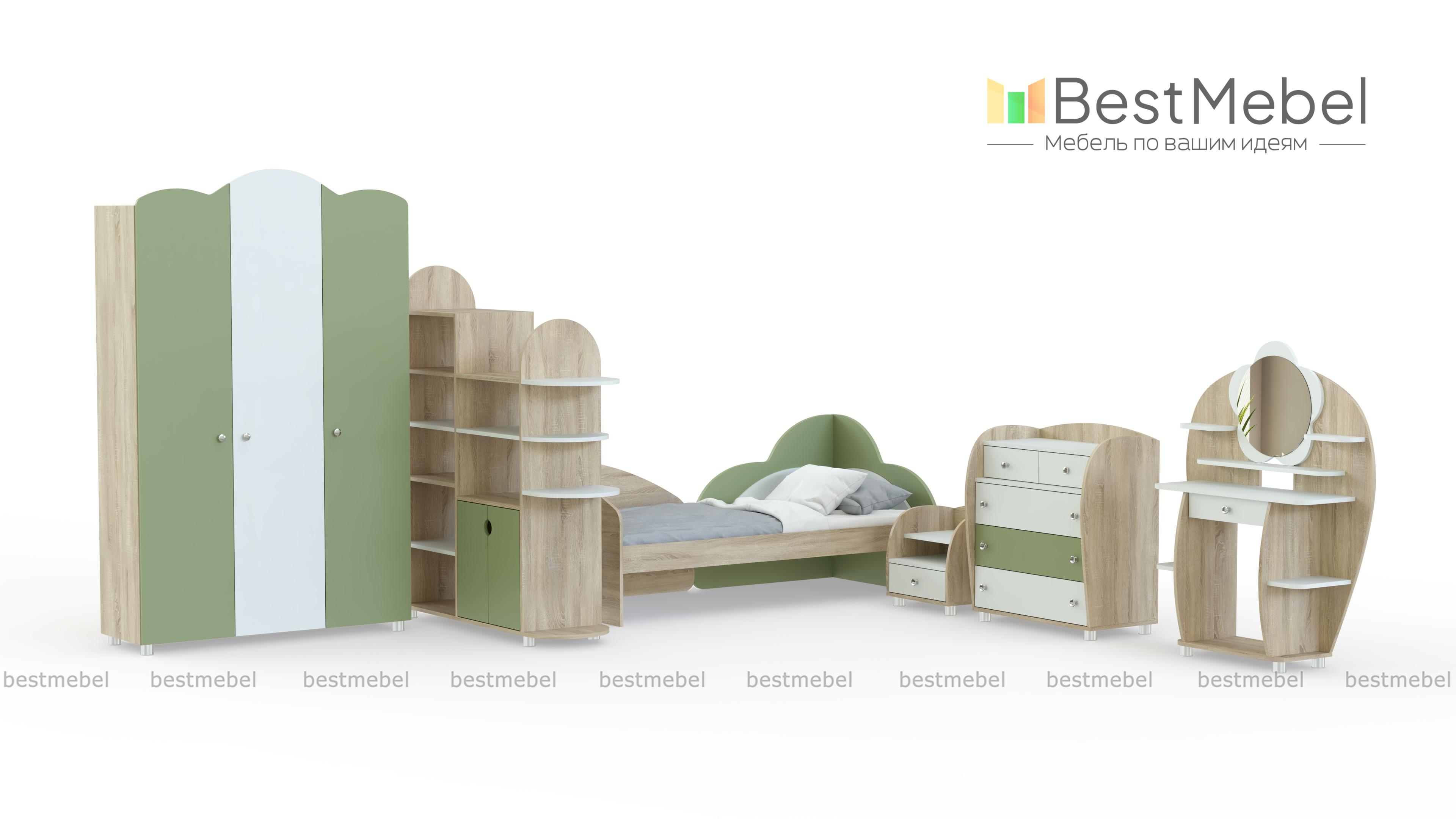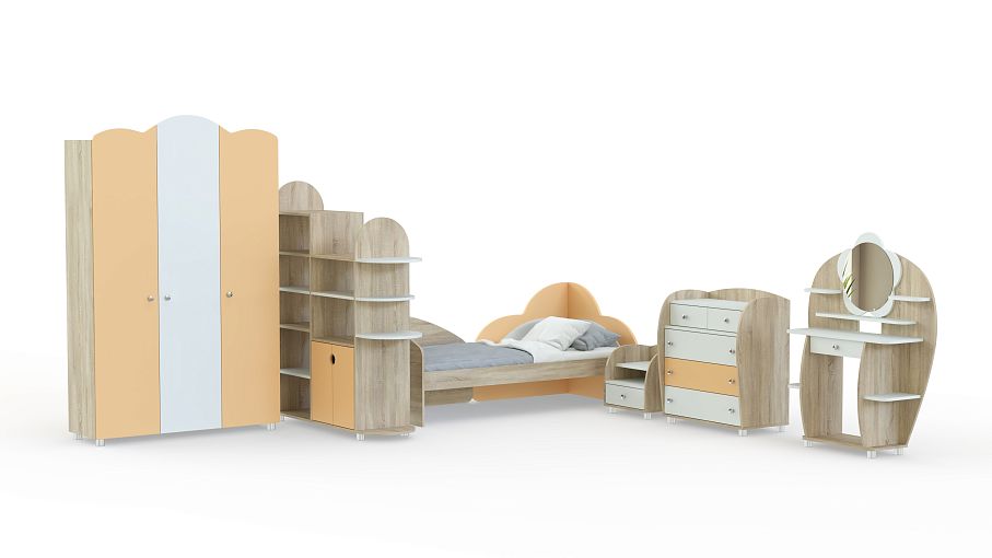 Детская комната Настенька BMS отличается изящным дизайном и нежной расцветкой в солнечных тонах. Комплект оборудован всем необходимым для комфорта маленькой хозяйки. В набор входят трехстворчатый шкаф для нарядов, стеллаж, который сможет частично зонировать пространство, кровать с оригинальным декором изголовья, прикроватная тумба, комод и туалетный столик с зеркалом. Скругленные углы обеспечат безопасное пользование. Купить детскую комнату Настенька BMS по лучшей цене приглашаем в наш интернет-магазин.
