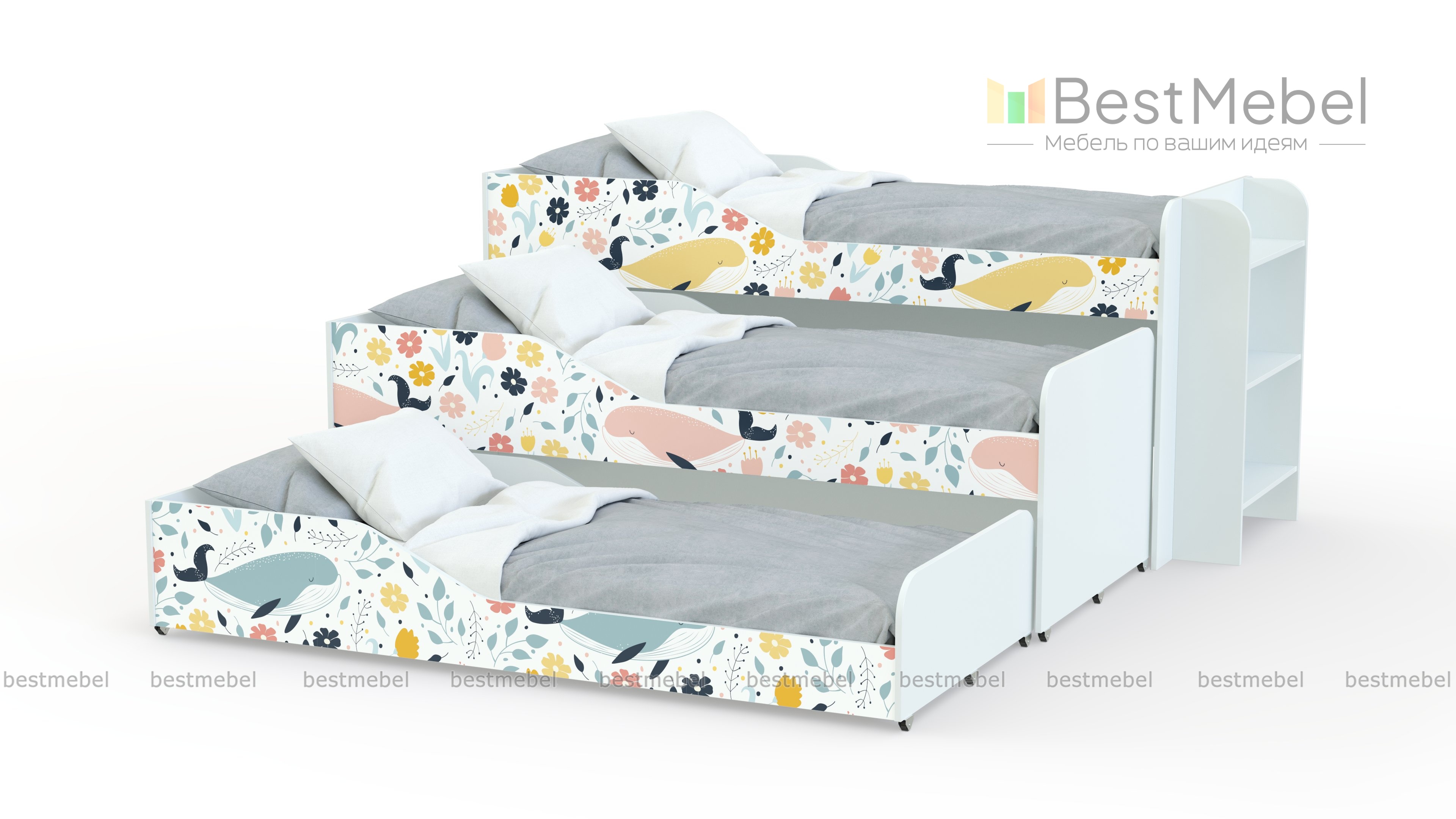 Детская раздвижная кровать Вика-3 BMS станет находкой для семей с тремя детьми, позволяя максимально выгодно использовать пространство. Практичная композиция включает в себя целых три спальных места – одно стационарное и два выкатных. Оборудованные колесиками, кровати легко перемещаются и могут быть установлены в любой части комнаты. Благодаря лаконичному дизайну и исполнению в белом цвете модель легко впишется в современные интерьеры. Купить детскую раздвижную кровать Вика-3 BMS и обустроить комфортную зону отдыха вам поможет наш интернет-магазин.