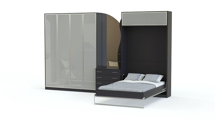 Шкаф-кровать трансформер Фиона 35 BMS позволит легко поменять гостиную зону на спальную. Элегантная современная композиция в насыщенных темных тонах и сером глянце объединила вместительный четырехдверный шкаф для одежды, комод с зеркалом и модуль-трансформер с откидной кроватью, антресолью и торцевыми полочками. Особенность дизайна – фигурно вырезанные элементы и контрастные рамки. Купить шкаф-кровать трансформер Фиона 35 BMS и эффективно использовать пространство вам поможет наш интернет-магазин.
