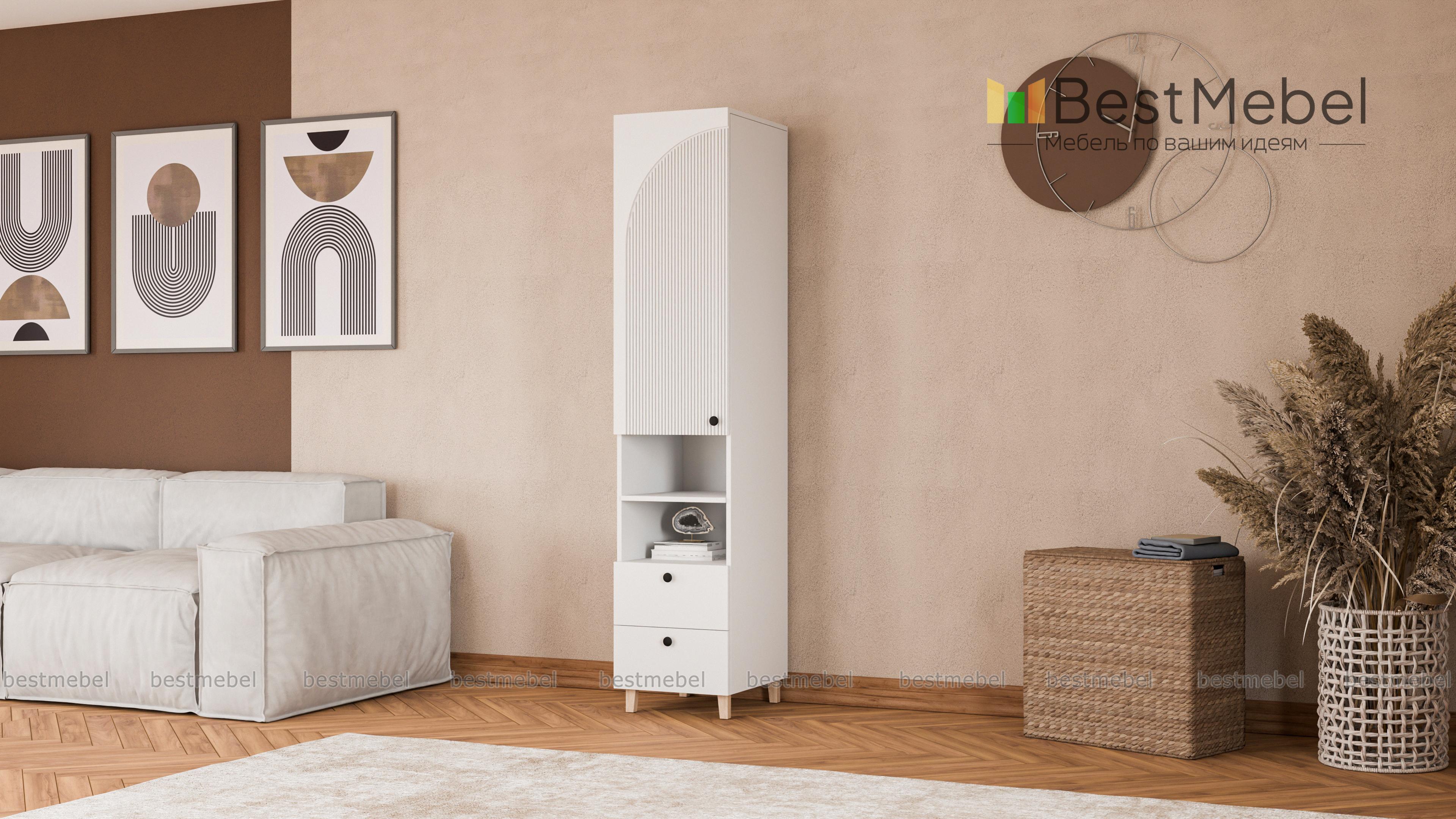 Шкаф-пенал Вивьен 5 BMS — небольшой и функциональный, отлично смотрится и в детской, и в гостиной. Древесного оттенка корпус с высокими ножками, изготовленный из ЛДСП, дополняет стильный фактурный фасад. Для удобного хранения конструкцией предусмотрены вместительное распашное отделение, ниша с полкой и два выдвижных ящика, расположенных снизу. Купить шкаф-пенал Вивьен 5 BMS с выбором размеров, цвета и фурнитуры вы сможете на сайте нашего интернет-магазина.