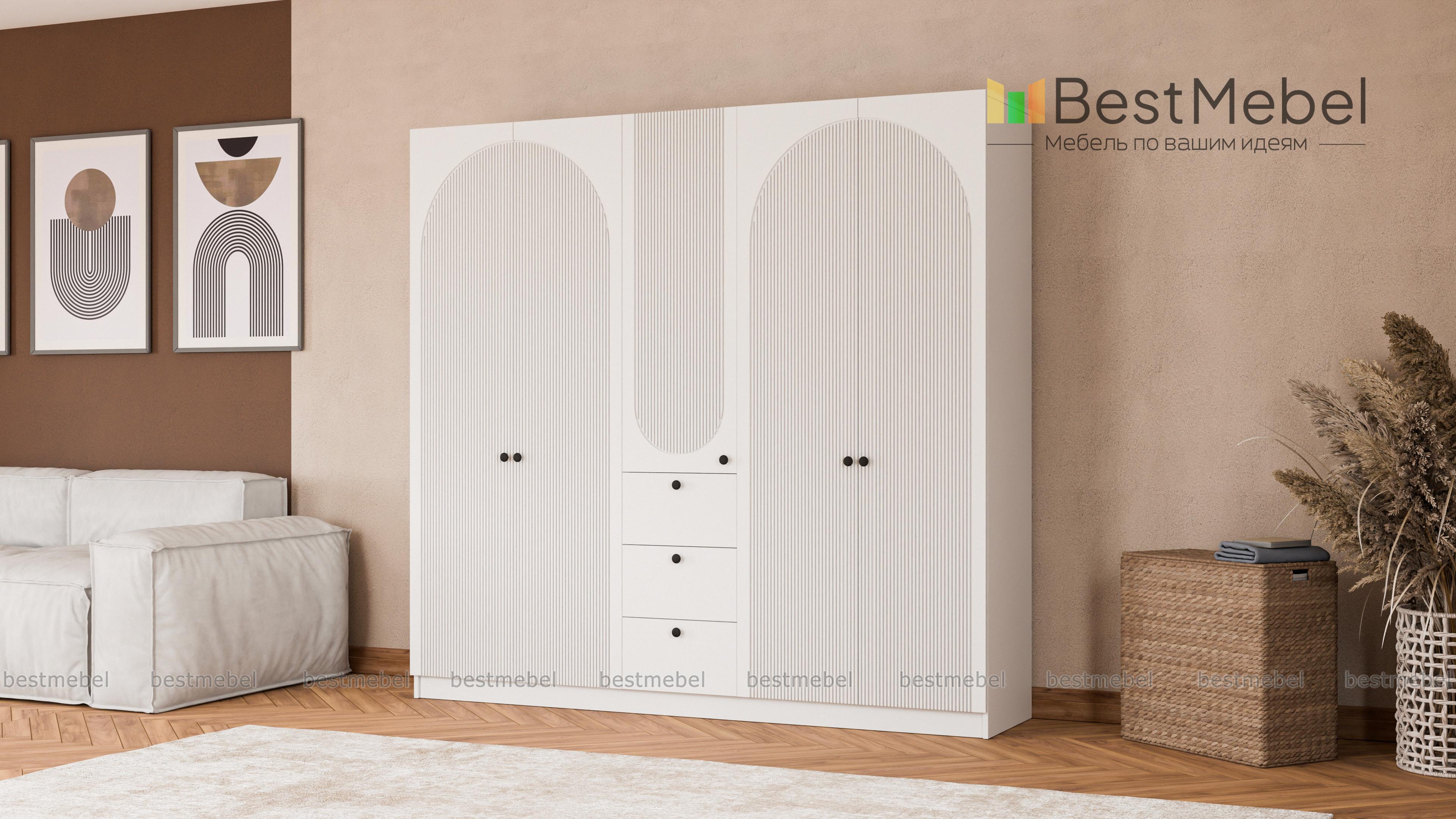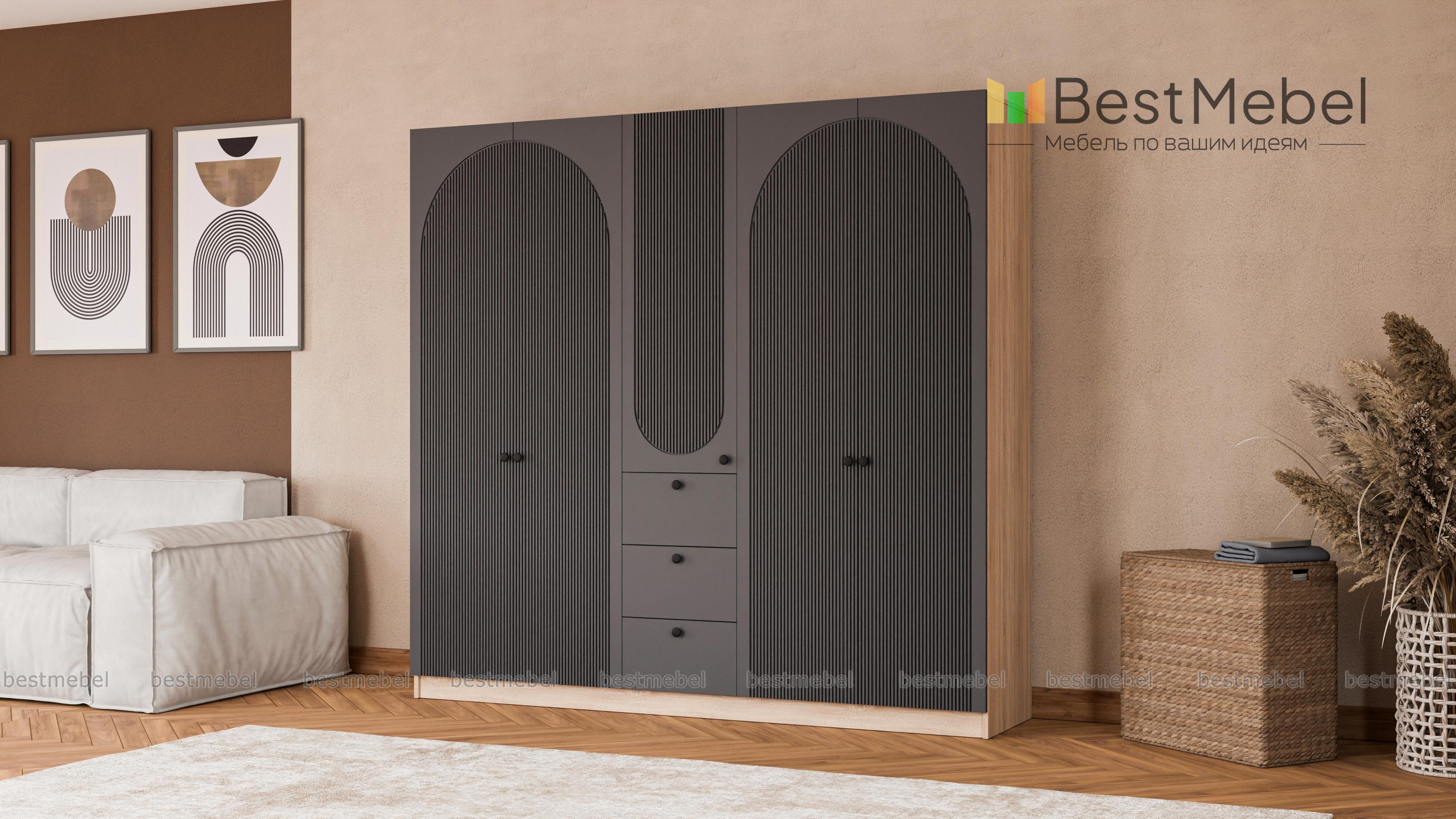 Шкаф распашной Вивьен 15 BMS — удобный и стильный, найдет себе место в спальне и прихожей. Двухдверные секции для одежды разделены комбинированным пеналом с бельевыми полками и тремя ящиками. Корпус и фасад шкафа выполнены в комфортных теплых тонах из материалов высокого качества, дверцы украшает броский геометричный рельеф. Купить шкаф распашной Вивьен 15 BMS с индивидуальным подбором размеров, цвета и компоновки вы всегда сможете на сайте нашего интернет-магазина.