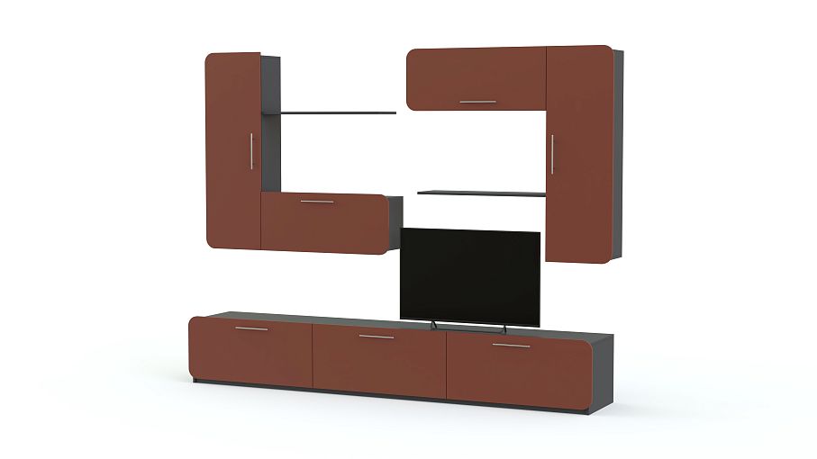 Стенка Модерно 3.1 BMS – это вместительная конструкция из отдельных модулей, которые легко вписать в интерьер, подчеркнув все его достоинства. Современная конструкция включает в себя все необходимое для размещения видео- и аудиоаппаратуры, предметов декора, книг и множества мелочей. Низкая тумба с тремя отделениями дополнена навесными секциями с распашными шкафчиками и открывающимися вверх и вниз дверцами. Эффектные терракотовые фасады скруглены по краям. Купить Стенку Модерно 3.1 BMS по лучшей цене приглашаем в наш интернет-магазин.