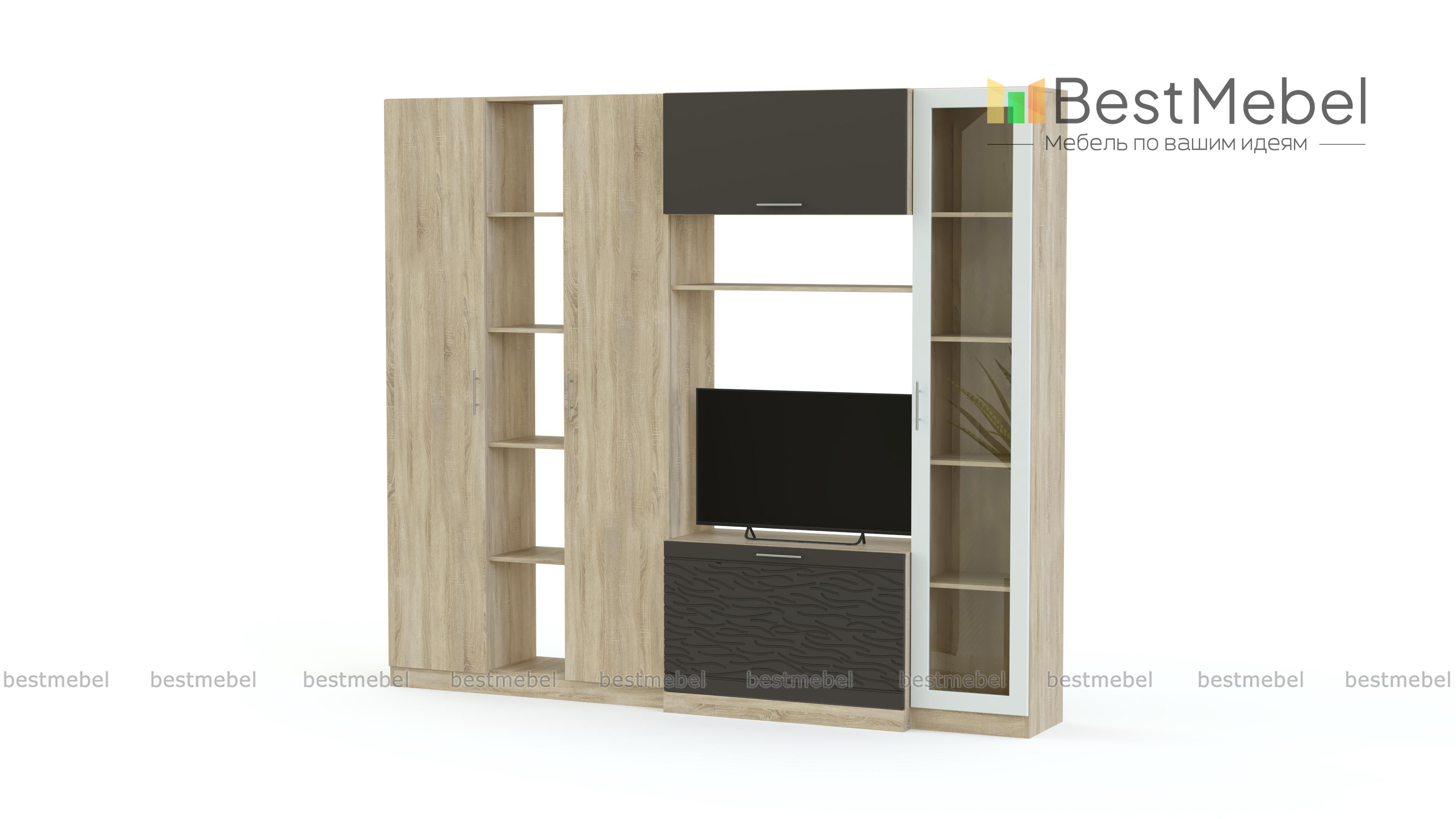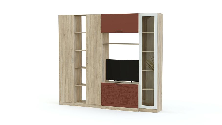 Стенка Вельвет 16 BMS поможет оборудовать уютную и функциональную гостиную в современном стиле. Лаконичная модель отличается визуальной легкостью и не будет перегружать интерьер лишними деталями. В комплекте оригинальный комбинированный шкаф с бельевыми колонками и стеллажом, тумба под ТВ, антресоль и высокая вместительная витрина. Фасады – актуальное сочетание древесных тонов и терракотового с 3D рисунком. Купить стенку Вельвет 16 BMS, подобрав оптимальные параметры, вы сможете в нашем интернет-магазине по приятной цене.
