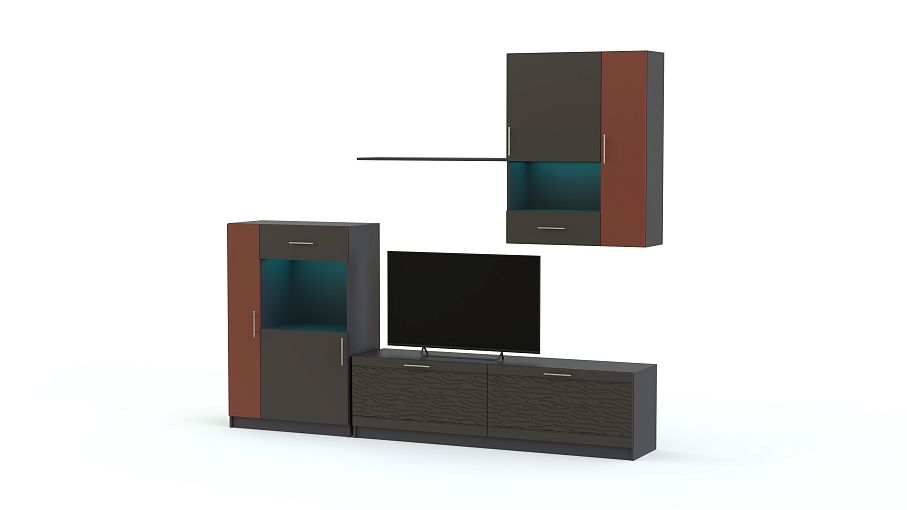 Стенка Вельвет 24 BMS выполнена в эффектном темном оттенке и станет центральным акцентом в интерьере современной гостиной. Минималистичный дизайн подчеркнет достоинства любой планировки, а модульная конструкция сэкономит полезную площадь. Стенка оборудована широкой низкой тумбой под ТВ, напольным двухдверным шкафом, открытой полкой и навесным шкафом с витринным отделением. Особенность комплекта – сочетание контрастных, украшенных 3D рисунком и матовых поверхностей. Купить стенку Вельвет 24 BMS, подобрав оптимальные параметры, приглашаем в наш интернет-магазин.