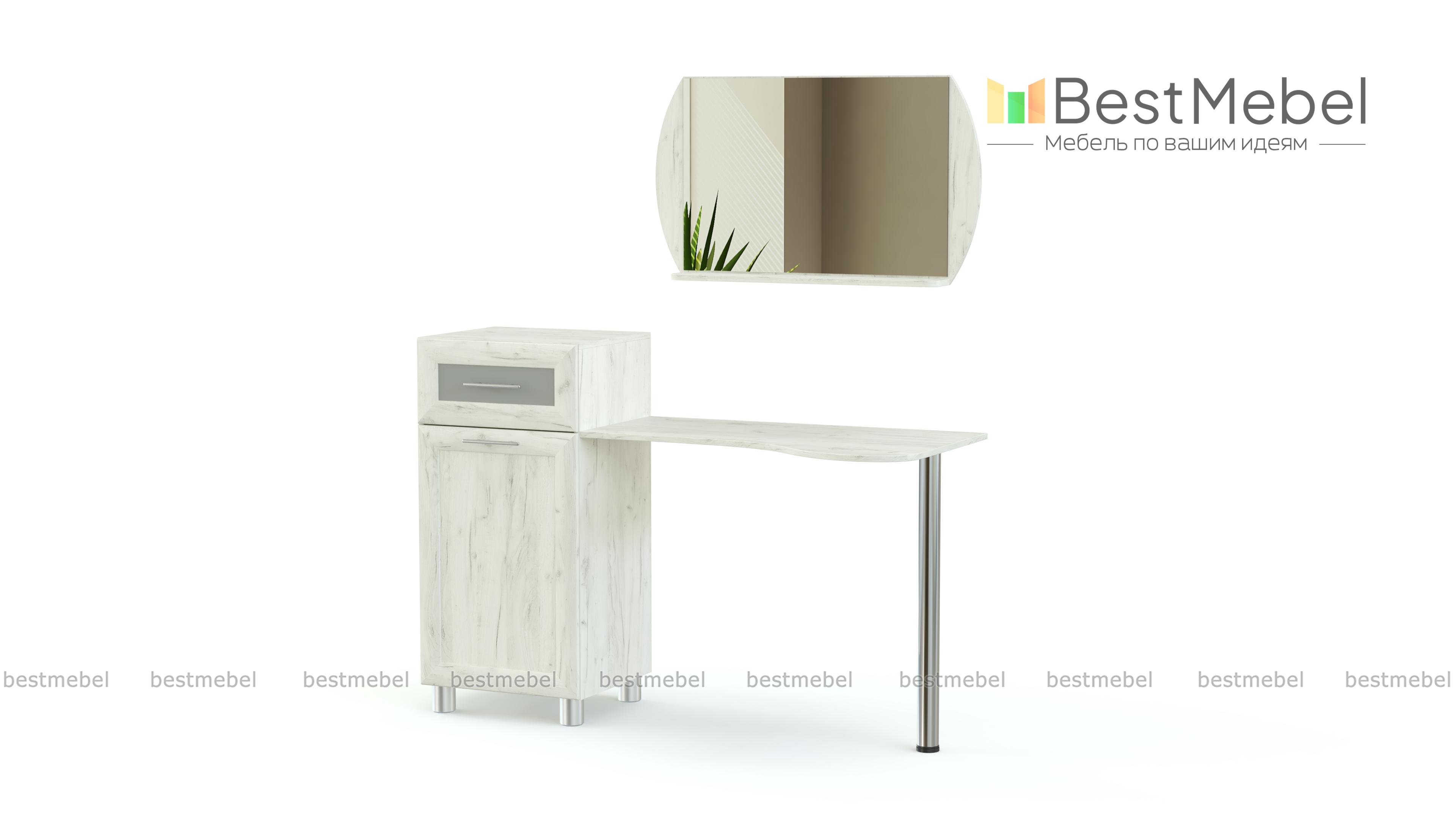 Туалетный столик Мелисса СТ 814 BMS – многофункциональная модель, которая совмещает рабочую поверхность эргономичной формы с удобной системой хранения. Устойчивая конструкция с хромированной опорой с одной стороны и тумбой с другой станет практичным дополнением комплекта для спальни в современном стиле. Благодаря выдвижному ящику и просторному отделению с полкой вы сможете разместить как аксессуары, так и разнообразные уходовые средства. Купить туалетный столик Мелисса СТ 814 BMS, подобрав цветовое решение, приглашаем в наш интернет-магазин.