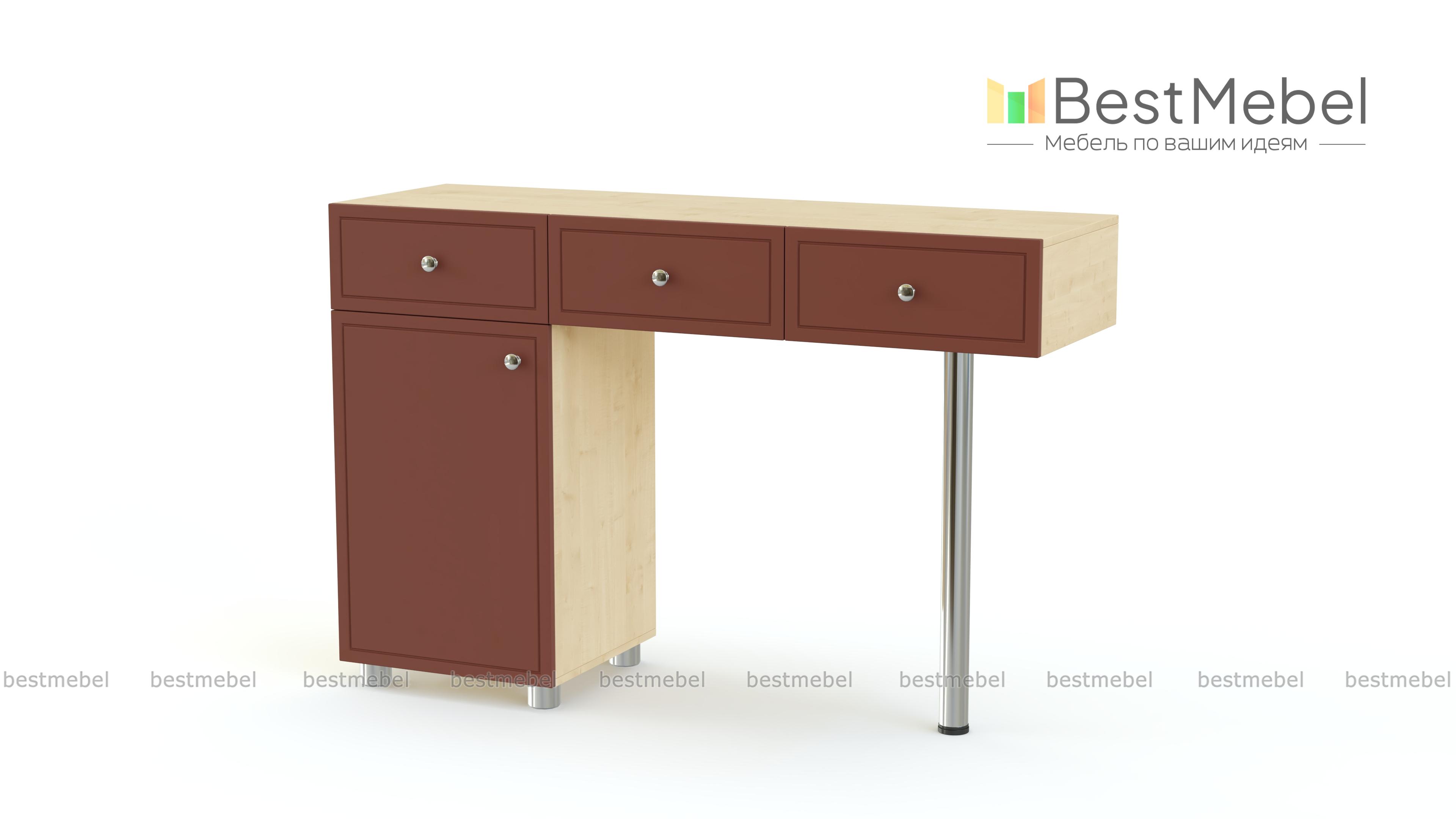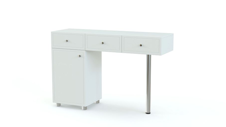 Туалетный столик Ноче СТ-11 BMS представляет собой элегантную консоль с тремя выдвижными ящиками, которую поддерживают распашная тумба и регулируемая хромированная опора. Удобная система хранения и просторная столешница позволят разместить под рукой все необходимые мелочи и сделать уход за собой комфортным. Фасады в светлых тонах декорированы фрезерованными линиями и дополнены ручками-кнопками. Купить туалетный столик Ноче СТ-11 BMS для современной спальни приглашаем в наш интернет-магазин.