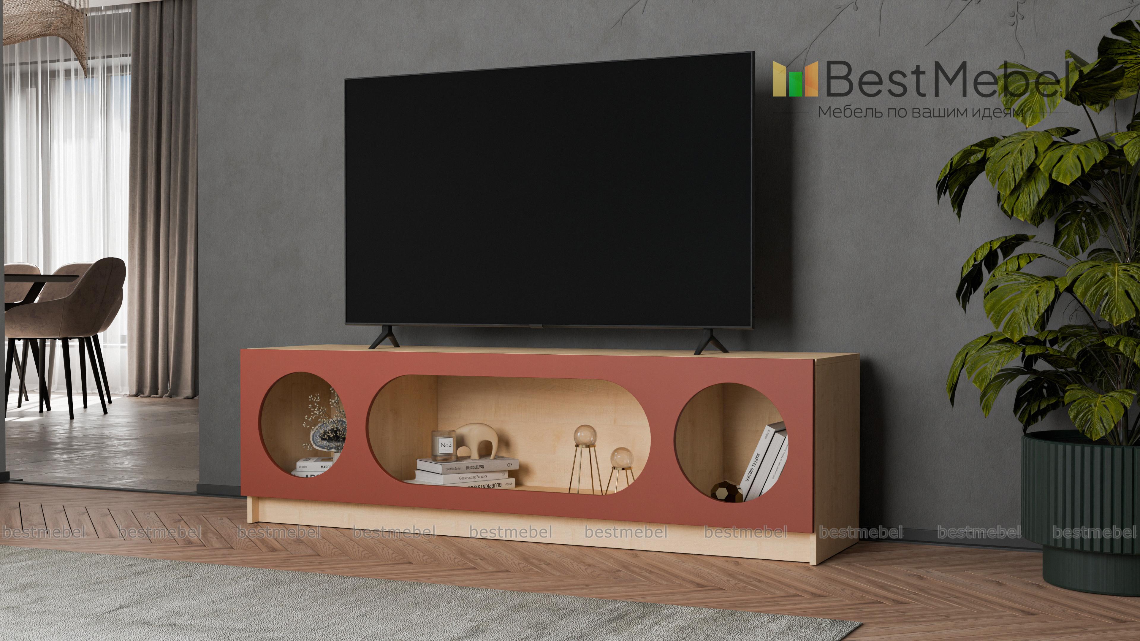 Тумба под ТВ Руди 3 BMS с фигурными отверстиями для демонстрации предметов выполнена в современном стиле. Под широкой надежной столешницей располагаются три полки разных размеров — для любимых гаджетов, книг и интерьерных украшений. Сочетание качественной ламинированной плиты и фасада из МДФ делает конструкцию прочной, долговечной и эстетичной. Купить тумбу под ТВ Руди 3 BMS в подходящей именно вам цветовой гамме можно на сайте нашего интернет-магазина.