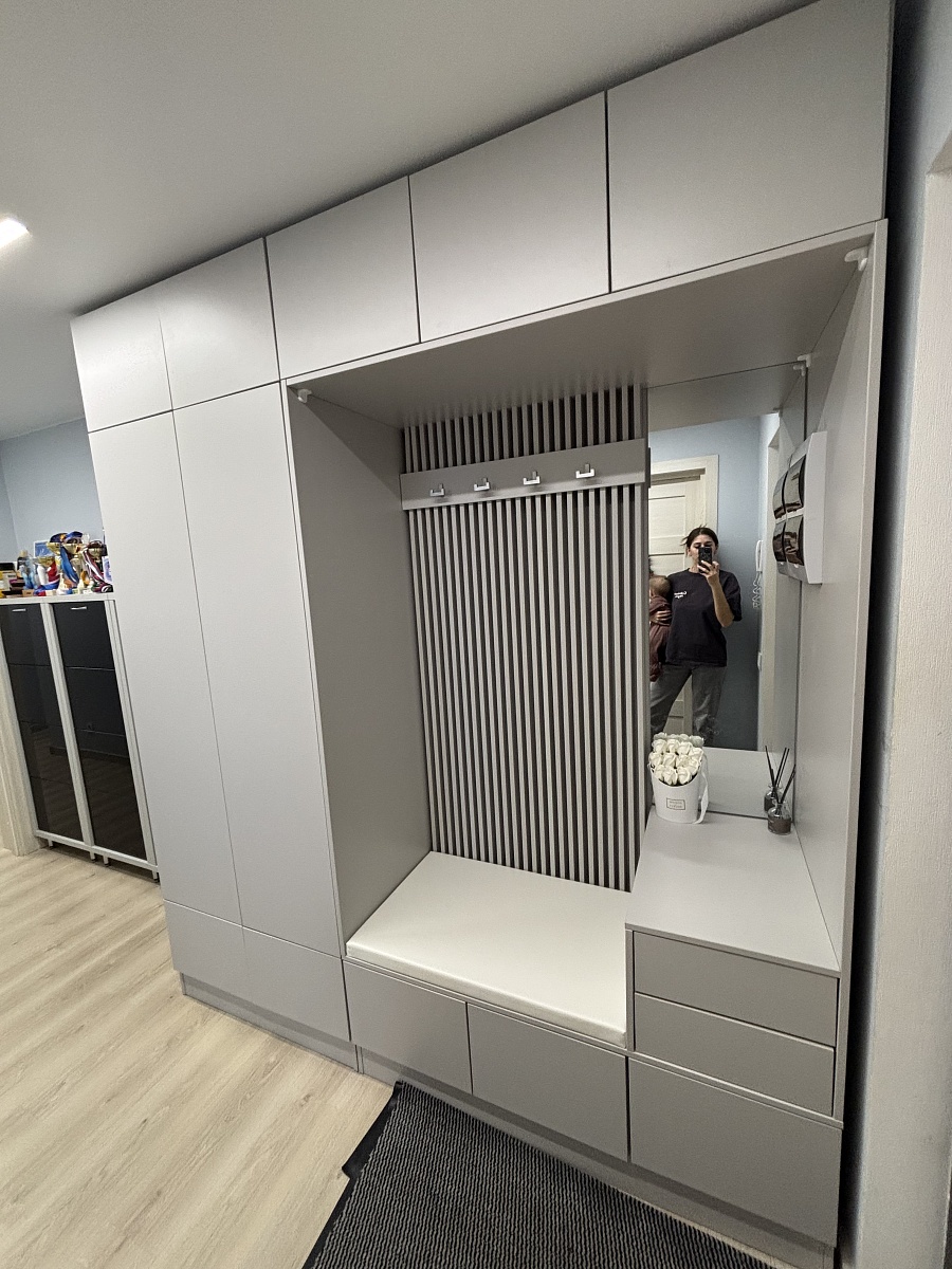 Заказ 00000270539, эскиз Прихожая Дублин 34 BMS (2050х2370х600)Нашли изначально фирму на известном маркетплейсе, изучили ассортимент прихожих и выбрали подходящий нам вариант готовой прихожей . Удобный конструктор на сайте помогает задать все нужные нам параметры - изменили размеры изделия, цвет, отобразили зеркально, добавили кромку. В общем, сумма заказа конечно же изменилась, но разница в цене была не критична. На изготовление и доставку ушло ровно 14 дней. Сборкой прихожей занимался мой муж сам, постепенно. Здесь есть минус - схема в бумажном варианте очень мелкая и неудобная , но в электронном виде можно через куар-код отсканировать и открыть версию с сайта, там пошаговая инструкция более доступная. По качеству прихожая соответствует ожиданиям. Есть небольшие сколы , но они не видны , к счастью. Из фурнитуры- мы решили заменить крючки, которые были в комплекте, на другие подходящие по цвету ( в комплекте были черные, а мы хотели серые), а также поменяли доводчики ( нажимной механизм push to open) на магнитный толкатель скрытого монтажа (это личное желание мужа). Фурнитура в соответствует качеству и цене .В целом покупкой остались довольны, планируем еще детскую мебель заказать. Рекомендую!