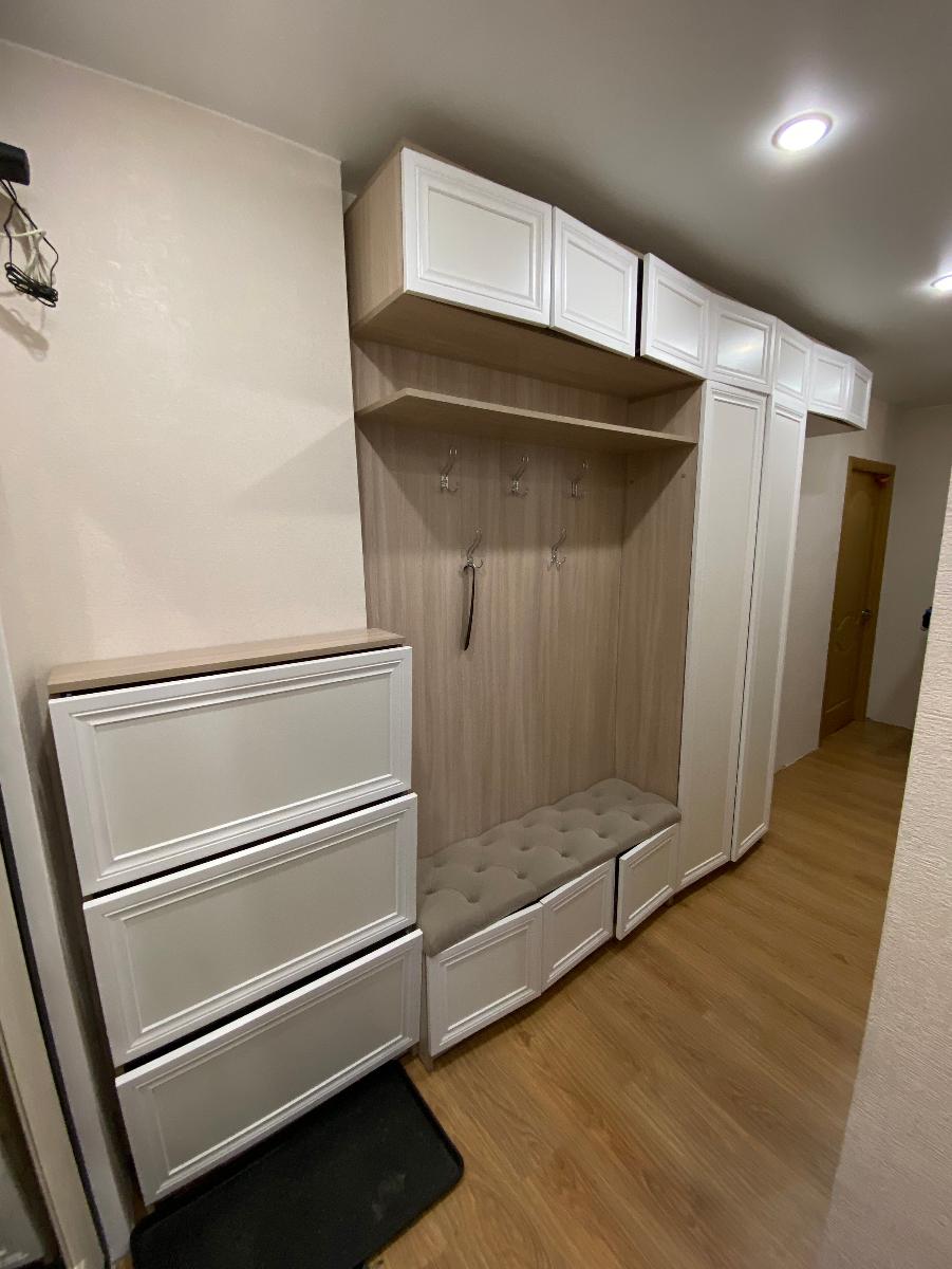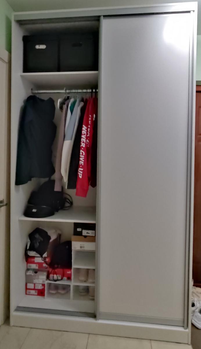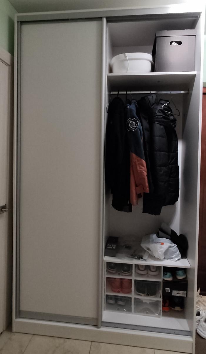 Заказ 00000443939, изделие Распашной шкаф Песня 3 BMS (1500х2100х500) (Платье - Белье (3)), фасады МДФ цвет Болотный софт тач, корпус ЛДСП цвет Ясень Шима Темный.Отличный платяной шкаф. Шкаф изготавливали около месяца. Пришлось подождать, но сейчас по такой цене шкафов хорошего качества не найти. Привезли в хорошей упаковке, порадовала аккуратная доставка. Все детали подписаны, отверстия на нужных местах, вся фурнитура, крепления и комплект для сборки в наличии. Собрали шкаф быстро. Пользуемся 3 месяца. Фурнитура не скрипит, не перекашивается. Шкаф тяжёлый, устойчивый. Свою функцию выполняет на 100%. Вместительный, удобный. Шкаф смотрится очень красиво, красивый цвет фасадов и корпуса. Фасад выбрали из МДФ, матовый и очень приятный тактильно.